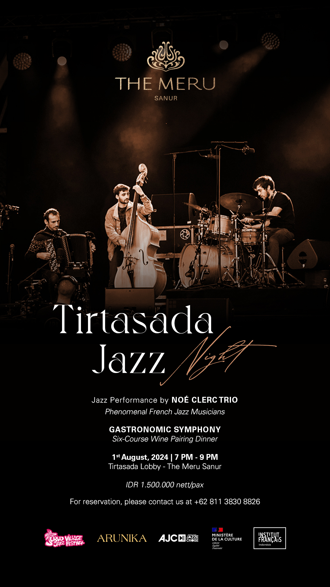 Experience an evening of wonder at The Meru Sanur - Tirtasada Jazz Night, a #UVJF Pre-Event to the Ubud Jazz Festival 2024. Enjoy a spectacular jazz performance by French musicians, the Noe Clerc Trio. Delight in a sophisticatedly curated fine dining journey with a 6-course set menu, including wine pairing by Arunika Restaurant.