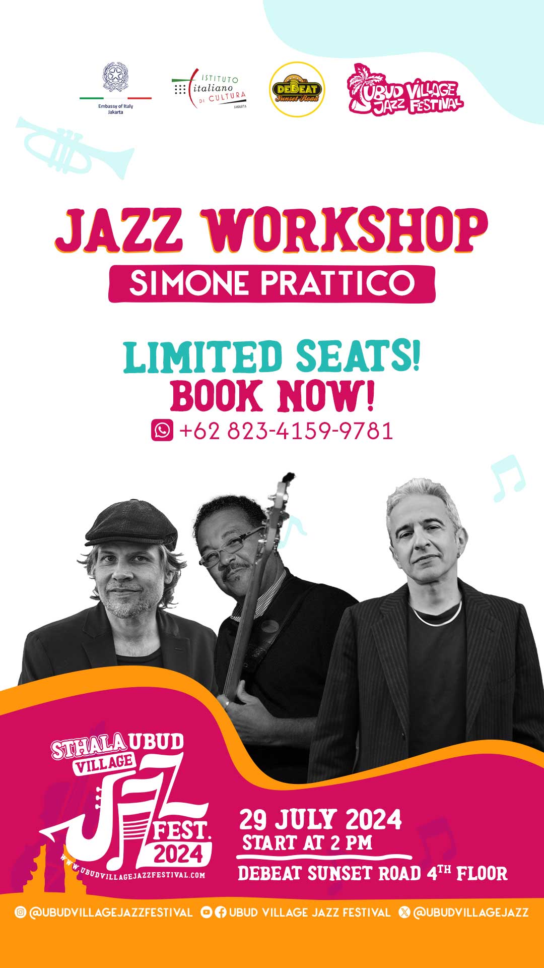 Kick off your Ubud Village Jazz Festival experience with our Simone Prattico workshop on July 29th at DeBeat Music Store, Sunset Road. Learn from this versatile drummer known for his unique grooves and rhythms. Be there for this exciting pre-event!