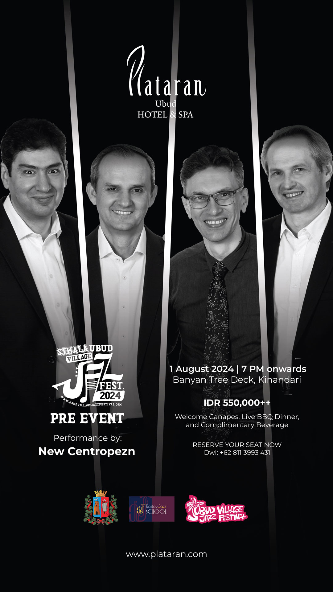 Join us at the Plataran Ubud Hotel & Spa for an unforgettable #UVJF Pre-Event evening featuring welcome canapés, a live BBQ dinner, and a complimentary beverage, all complemented by captivating jazz performances from New Centropezn.