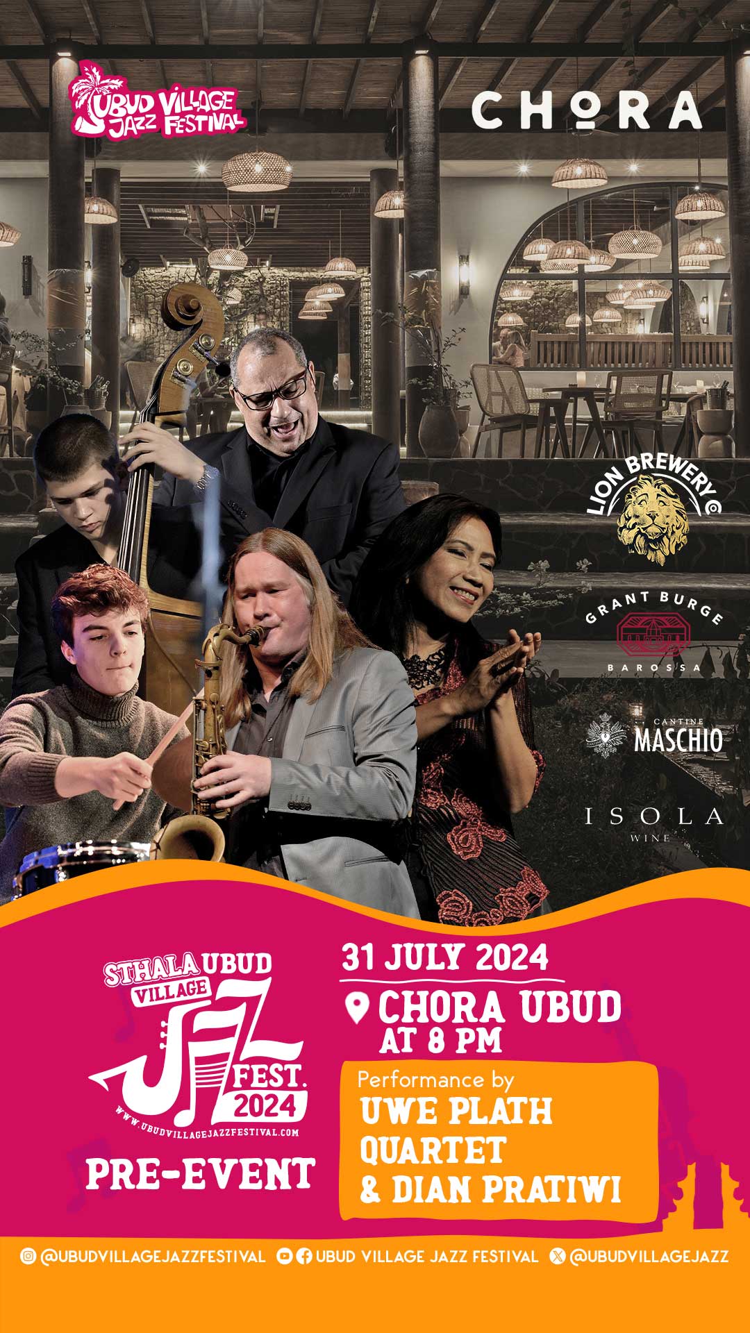 Join us for an enchanting #UVJF Pre-Event performance at Chora Restaurant in Ubud! Experience the incredible Uwe Plath, an award-winning saxophonist from Germany, alongside Gregory Gaynair, Jakob Hein, and Kester Jahn. Plus, don’t miss the stunning vocals of Indonesia’s own Dian Pratiwi, renowned in Europe for her mesmerizing voice. Get ready for an unforgettable jazz night!