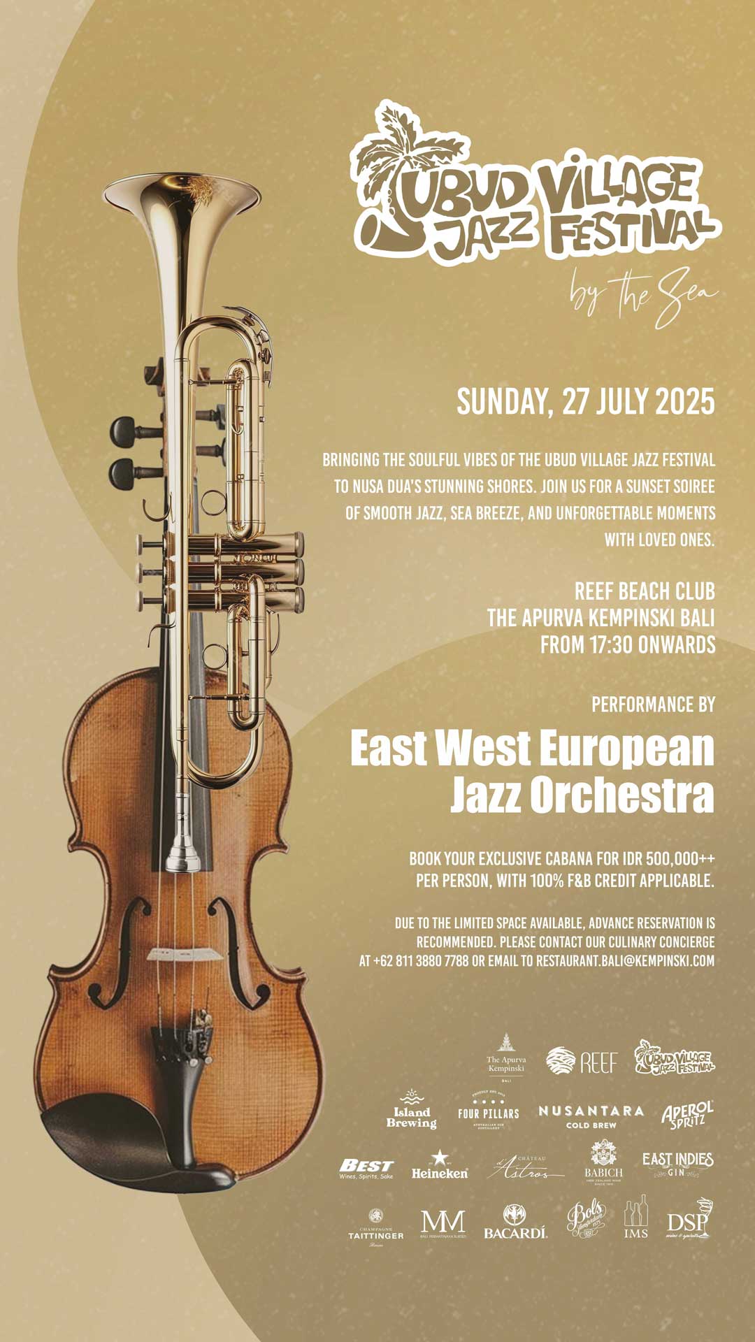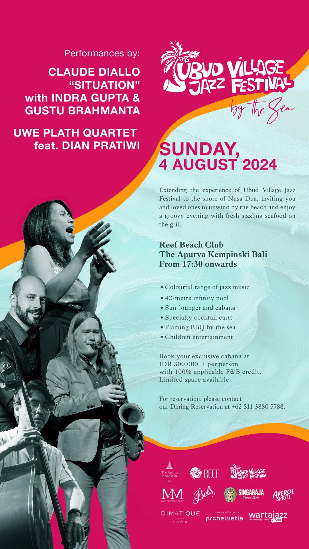 This year’s #UVJF Post-Event takes us to the beautiful shores of Nusa Dua! Join us at the Reef Beach Club at The Apurva Kempinski Bali on Sunday, 4 August 2024, for unforgettable groovy performances by Claude Diallo “Situation” with Indra Gupta & Gustu Brahmanta, and the Uwe Plath Quartet feat. Dian Pratiwi. Relax by the beach, savor fresh sizzling seafood, and let the jazz melodies transport you to a world of musical bliss.